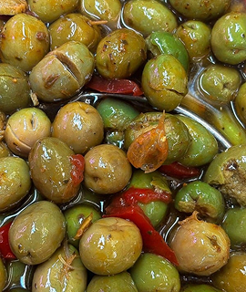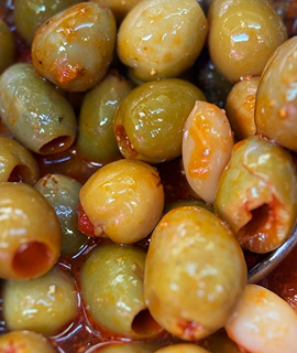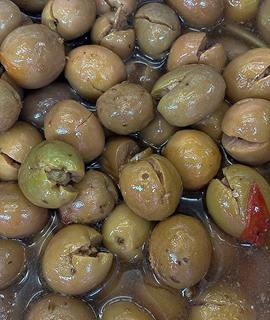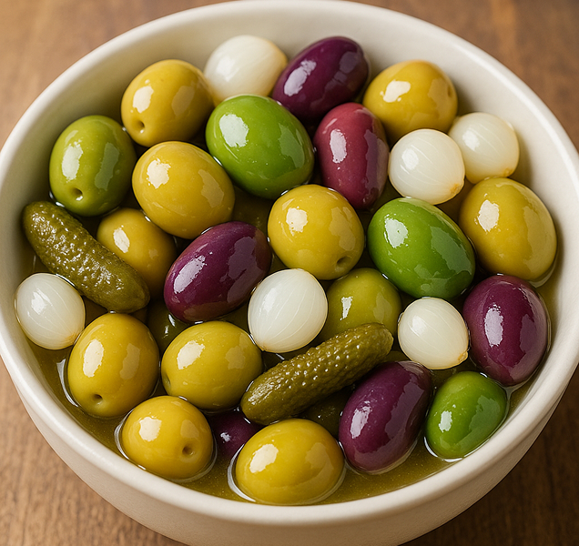 Surtido elaborado por nosotros, compuesto de aceituna sevillana, baja en sal, cebollitas, pepinillos y aragón.